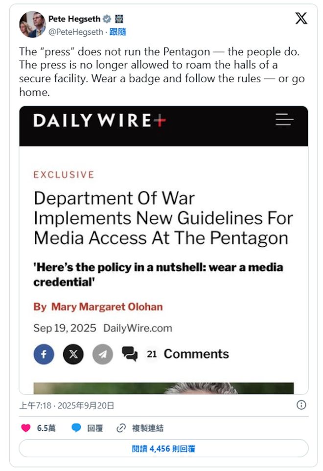 美国多间传媒报道,五角大楼告知记者必须同意不披露未经授权资讯,否则将吊销其记者证。 2025年9月20日,美国防部长赫格塞思(Pete Hegseth)在X证实消息并称,传媒无权掌管五角大楼,佩戴证件并遵守规则,否则请打道回府。 (网页截图)