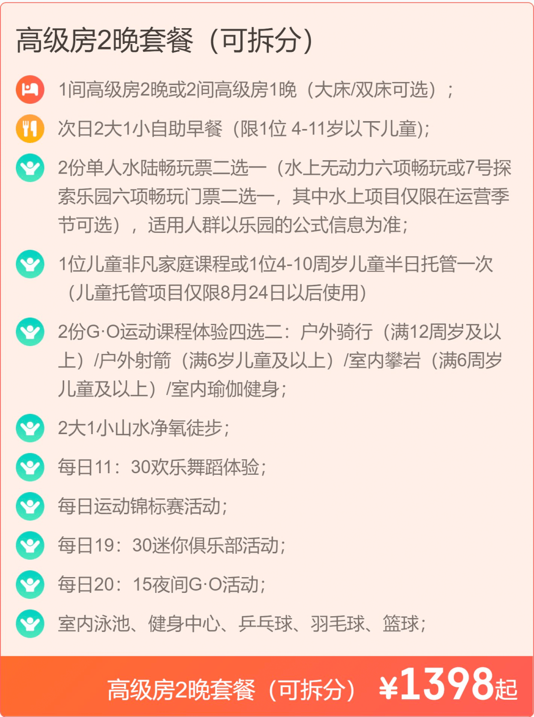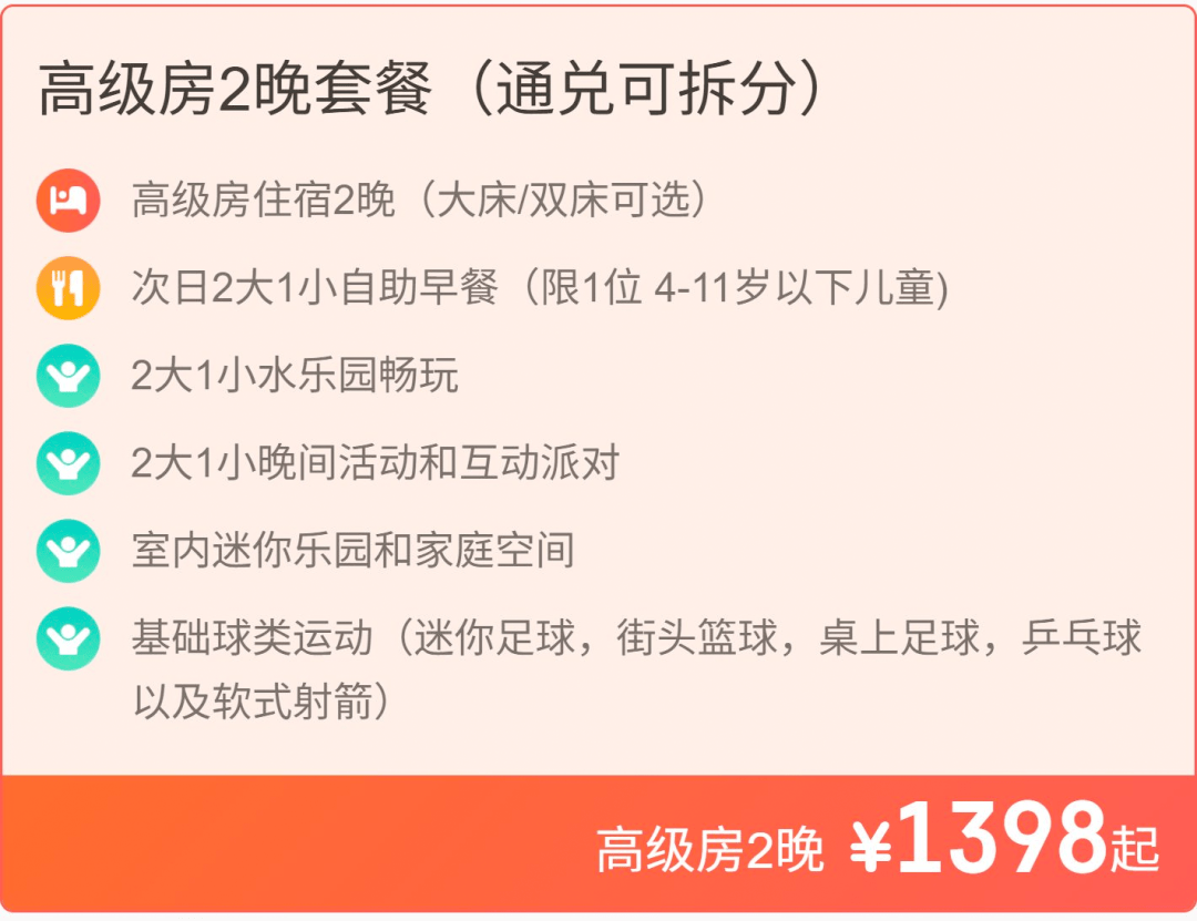 本次套餐1398元起 2晚入住含早套餐,可以说是暑期过后非常优惠的价格了。本次促销套餐不约可退,并且预约时间可到年底,非常适合先囤再约。