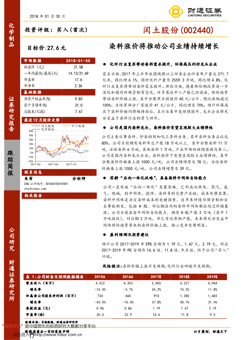 投资评级:买入(首次) 跟踪简报公司研究财通证券研究所市场数据2018-01-30 收盘价(元) 21.58 一年内最低/最高(元) 14.13/21.69 市盈率17.6 市净率2.26 基础数据 净资产收益率(%) 9.83 资产负债率(%) 21.0 总股本(亿股) 7.67 最近12月股价走势 -20% -10% 0% 10% 20% 30% 40% 50% -062017-10闰土股份中小板指化学制品表1:公司财务及预测数据摘要2015A 2016A 2017E 2018E 2019E 营业收入(百万) 4,5224,3535,4056,2276,964 增长率-15.4% -3.7% 24.2% 15.2% 11.8% 归属母公司股东净利润(百万) 7346609101,2801,683 增长率-43.0% -10.0% 37.8% 40.7% 31.4% 每股收益(元) 0.960.861.191.672.19 市盈率(倍) 20.622.916.611.89.0 化纤行业复苏带动染料需求提升,环保高压利好龙头企业需求方面,2017年上半年我国规模以上印染企业印染布产量达271.7亿米,同比增6.1%,同时化纤产量为2559.3万吨,同比增4.8%,化纤行业复苏将带动染料需求提升。